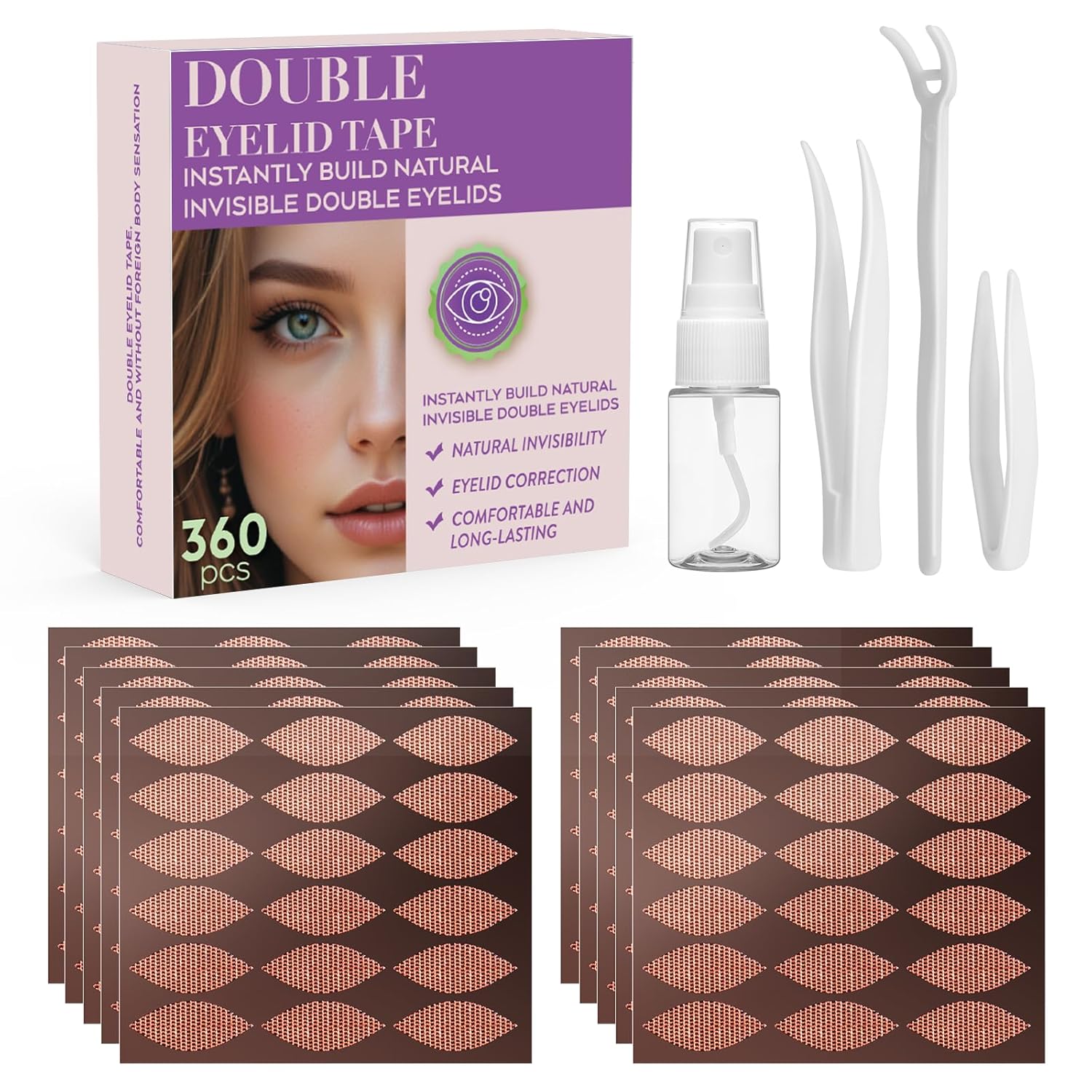 Our complete kit contains: 360 lace-effect double eyelid strips (6-month supply) Precision-point tweezers (angled design for flawless pickup) Rounded-edge tweezers (safe positioning tool) Y-shaped contouring fork (professional shaping aid) Hydration-activation spray bottle (5ml travel-friendly size)