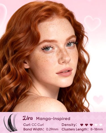 - LIRA – Manga-Inspired Style: LIRA manga lash clusters bring that soft, fluttery anime charm to life. Airy and spiky, it lifts your eyes for a playful, wide-eyed look. Light, whimsical, and full of personality—your main character moment starts with LIRA.