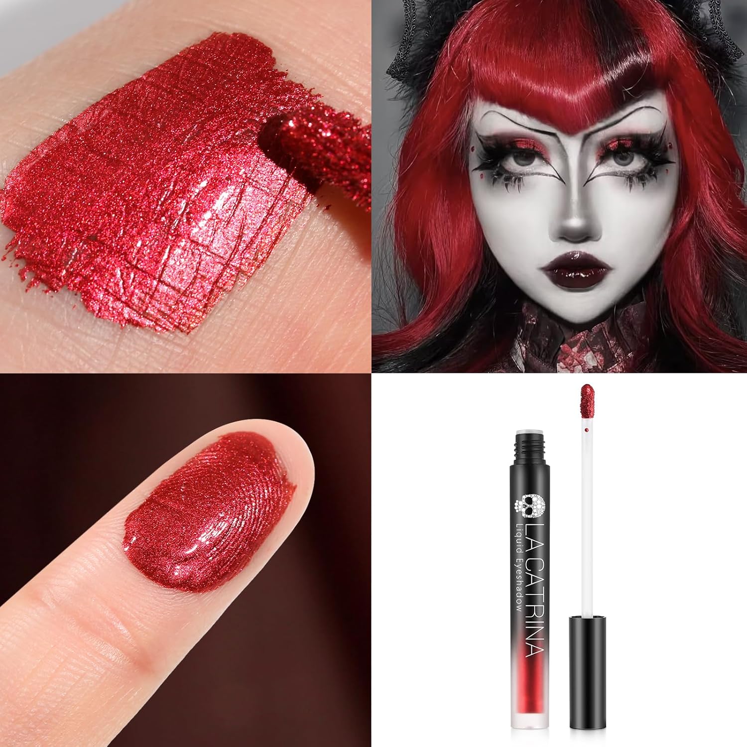 - Various Makeup Looks: This red metallic liquid eyeshadow has a high-shine and metallic, reflective finish that gives a wet, foil-like look. It suits for evening looks, daily look, glamorous party makeup, smoky eye looks, goth or festive styles for holidays