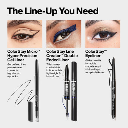 Create high-impact eye looks with Revlon’s Colorstay Micro™ Hyper Precision Eye Liner. The gel formula glides on smoothly for intense pigmentation and a rich color finish. Create intense, beautifully defined eye looks. Want macro impact? Go micro.