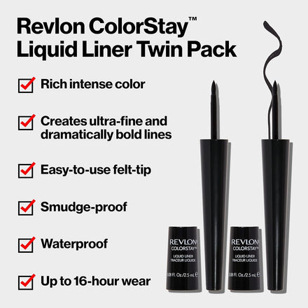 Elegant, sexy, and sophisticated, REVLON color stay liquid liner allows you to emphasize your eyes with precision. Glides on effortlessly for a thin or thick line, dries quickly, and lasts all day long. Now available in twin packs for added convenience.