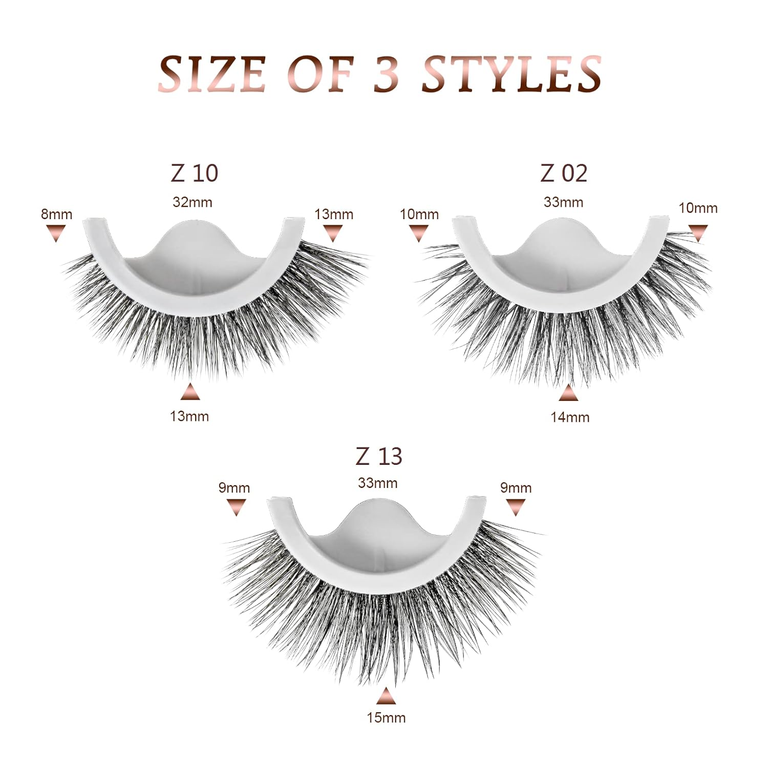 • [3 Styles, Natural Makeup Effect] Fake eyelashes include 3 styles with different lengths, 10-14mm, 8-13mm and 9-15mm. These self-adhesive false eyelashes are made of high quality synthetic fiber with a soft texture like natural lashes, you can choose the right style according to the occasion you attend