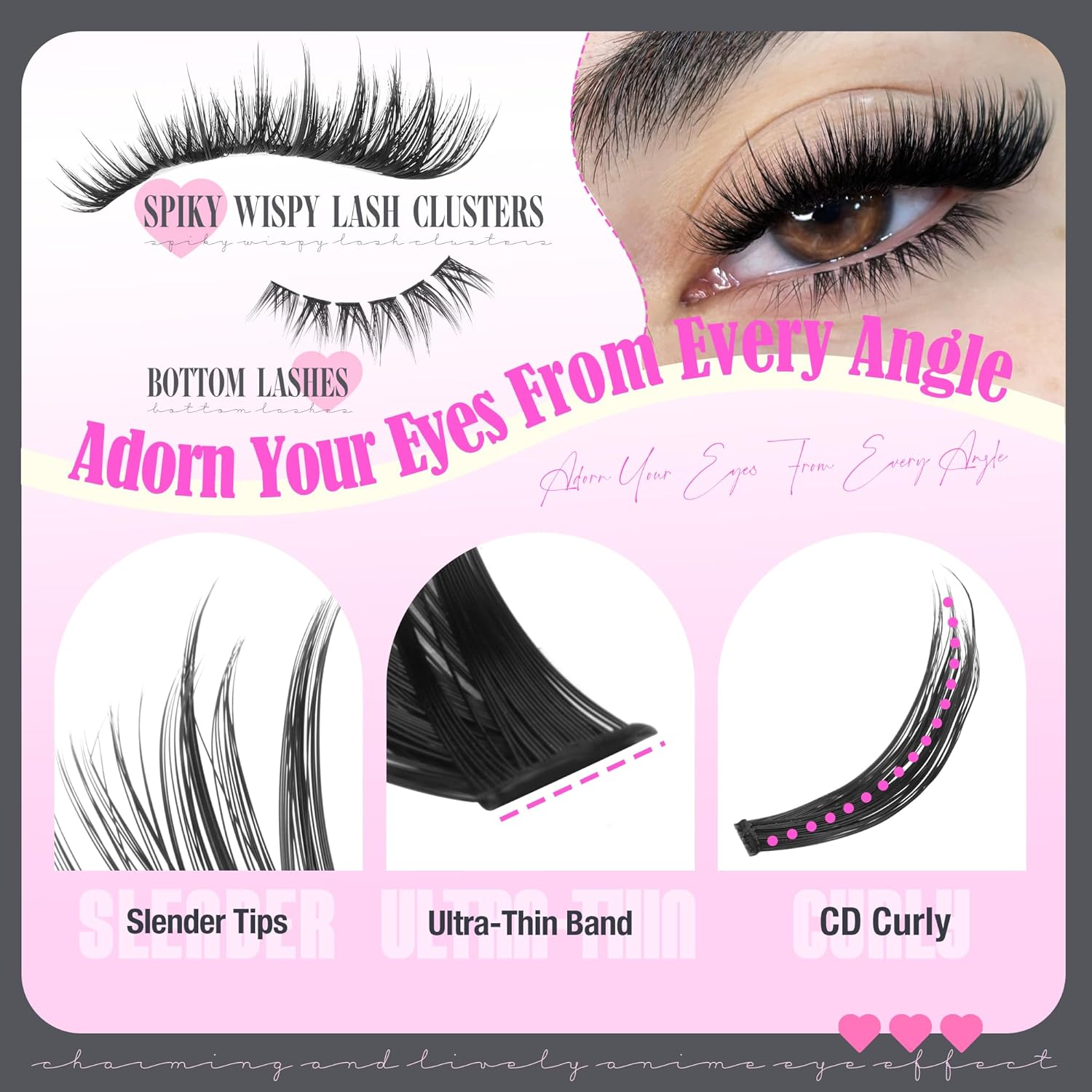 - Spikes Lash Clusters Look: Our wispy eyelash clusters have exceptionally slender tips while maintaining a voluminous appearance. These spiky cluster eyelash extensions effectively enlarge and deepen your eyes, and their spikes add a touch of liveliness, making your eyes even more captivating. Whether itās for parties, trips, or daily wear, these volume cluster lashes will add a great touch to your makeup look.