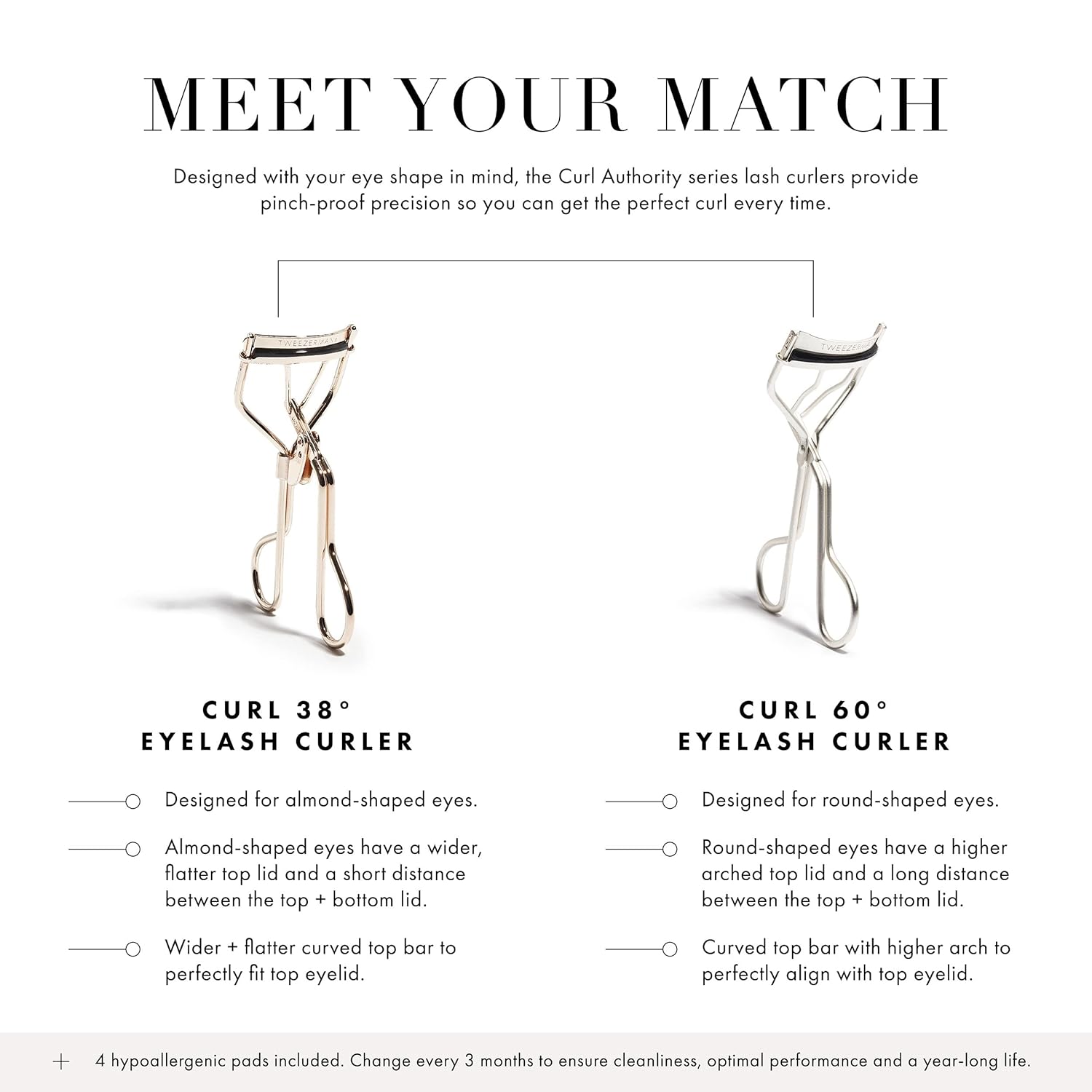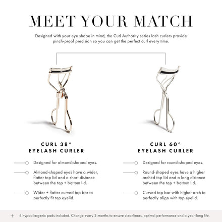 Crafted for diverse eye shapes so no lash goes uncurled, the innovative design of the Curl 38-degree Eyelash Curler has a customized, tailored radius ideal for almond-shaped or deep-set eyes. Curler is flawlessly structured for optimal control. 3 replacement pads included. We recommend changing the curler after one year of use.