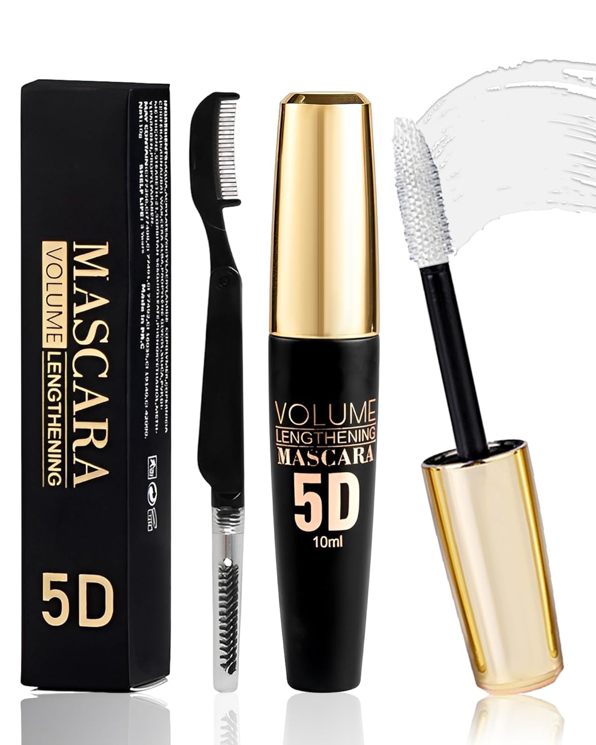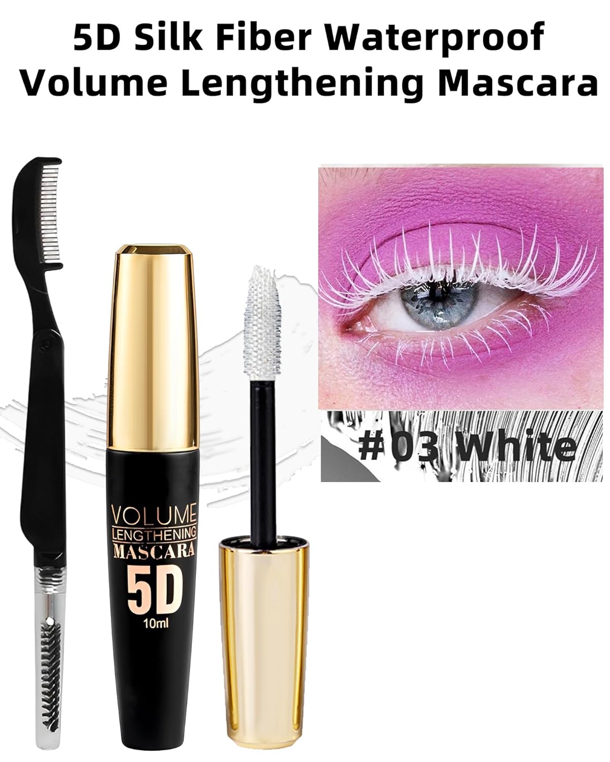 White Waterproof Mascara Primer for Eyelash, 5D Silk Fiber Lashes Extension Colored Tube Mascara with Eyelash Brush, Long Lasting Smudge-proof Volumizing Lengthening, Eye Makeup Party Gift for Women